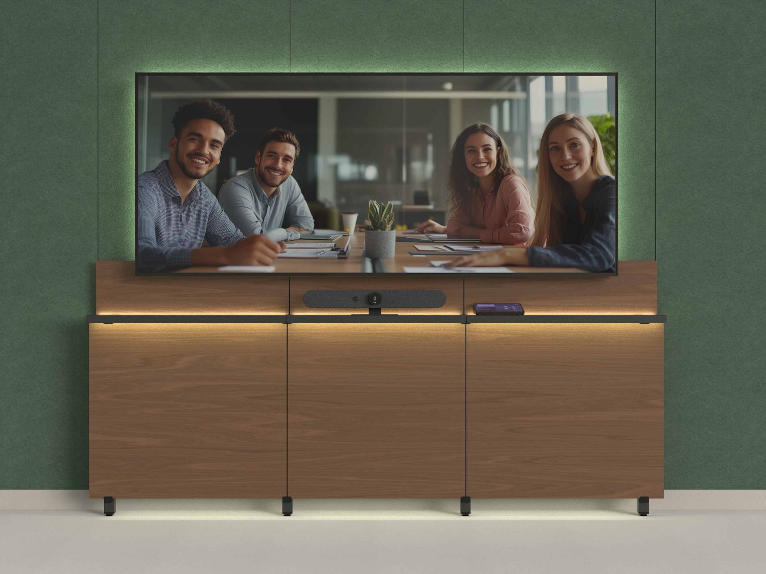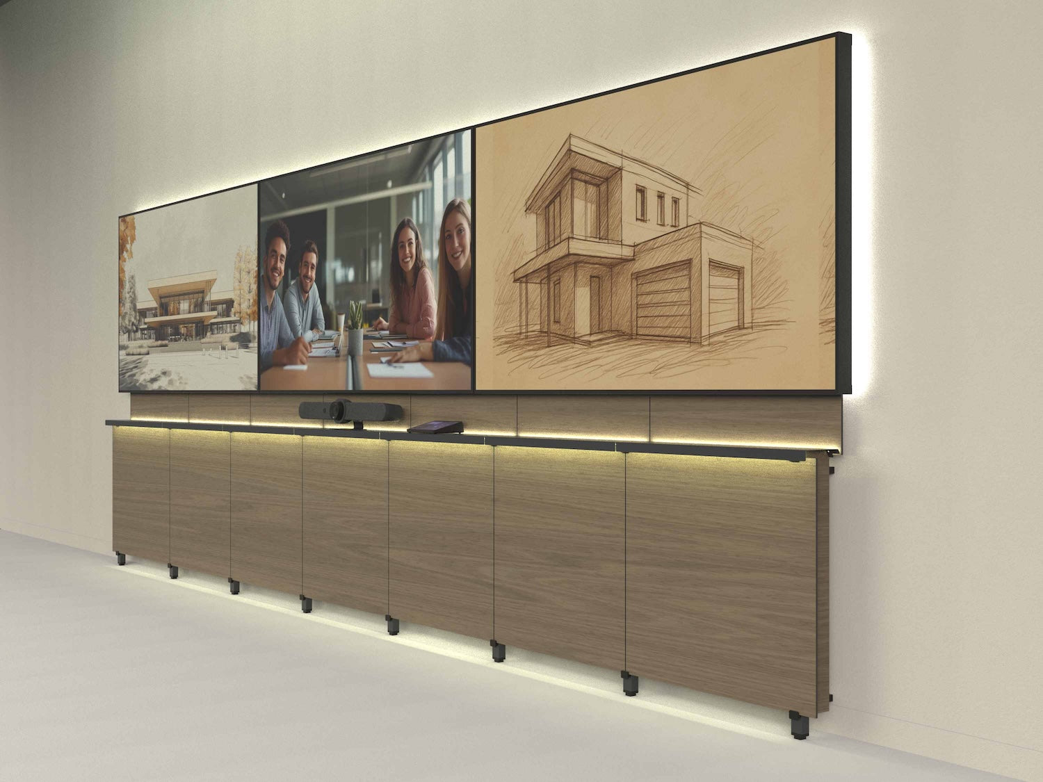 Heckler Framework is a breakthrough product line to design and deploy video meeting walls at scale. Though it outwardly resembles traditional credenza cabinetry, Heckler Framework is, in fact, a modular structural system engineered for maximum flexibility, speed of deployment, and global standardization. Designed for commercial AV professionals and enterprise IT teams, Heckler Framework enables the creation of video meeting environments of any size — from single-display huddle rooms to large, immersive multi-display board rooms.