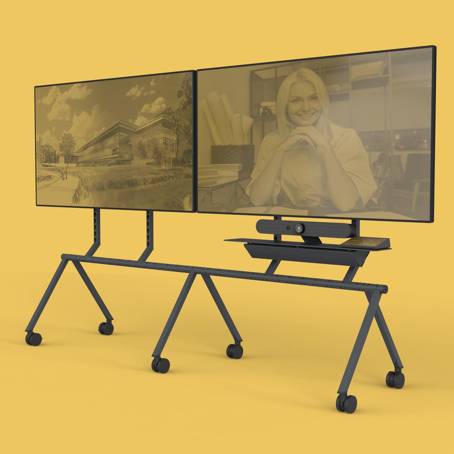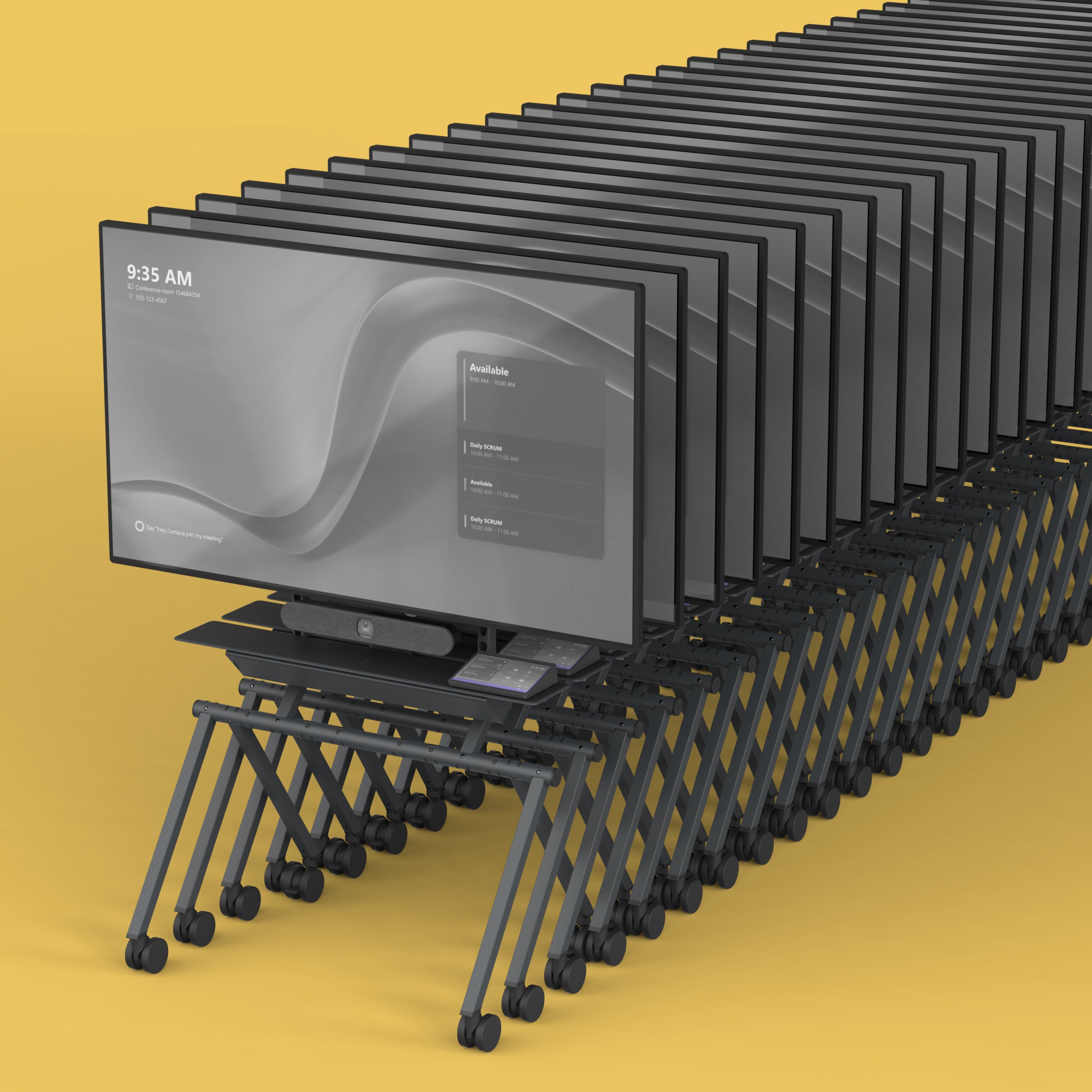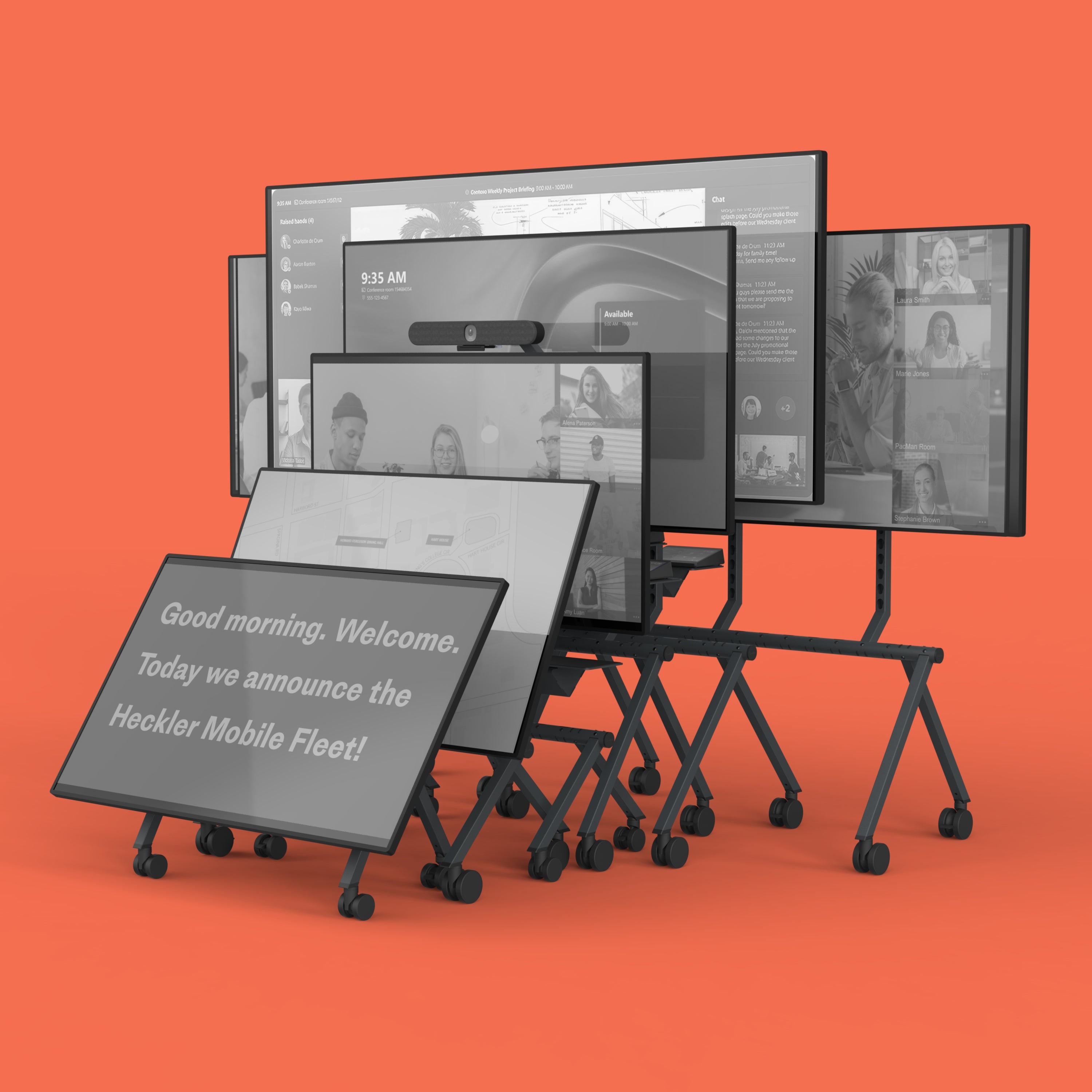 Meet the new Heckler Mobile Fleet! These six unique commercial-grade rolling stands are crafted to meet diverse usage scenarios, making them perfect for open offices, meeting rooms, breakout spaces, event spaces, and auditoriums. Each rolling stand in the fleet features: