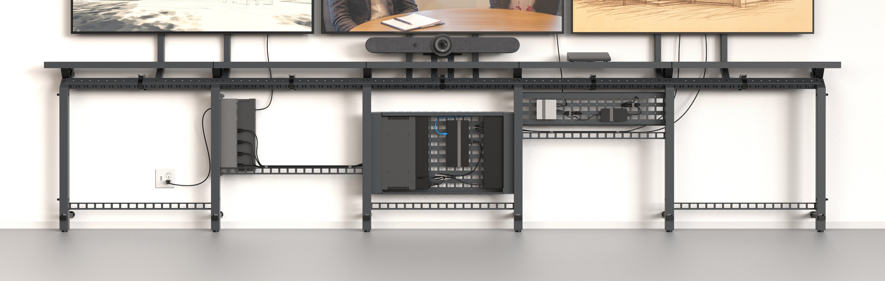 The Legs carry all structural load. The rear surface of each Leg features an array of tool‑free mounting points for fast attachment of gear‑mounting accessories. Legs ship in two sizes: Short Legs position the shelf at 31 inches AFF, while Tall Legs position the shelf at 40 inches AFF—delivering ideal camera positioning for small and large meeting spaces.