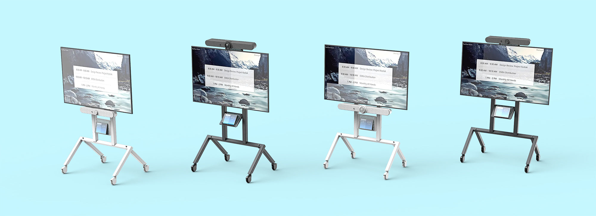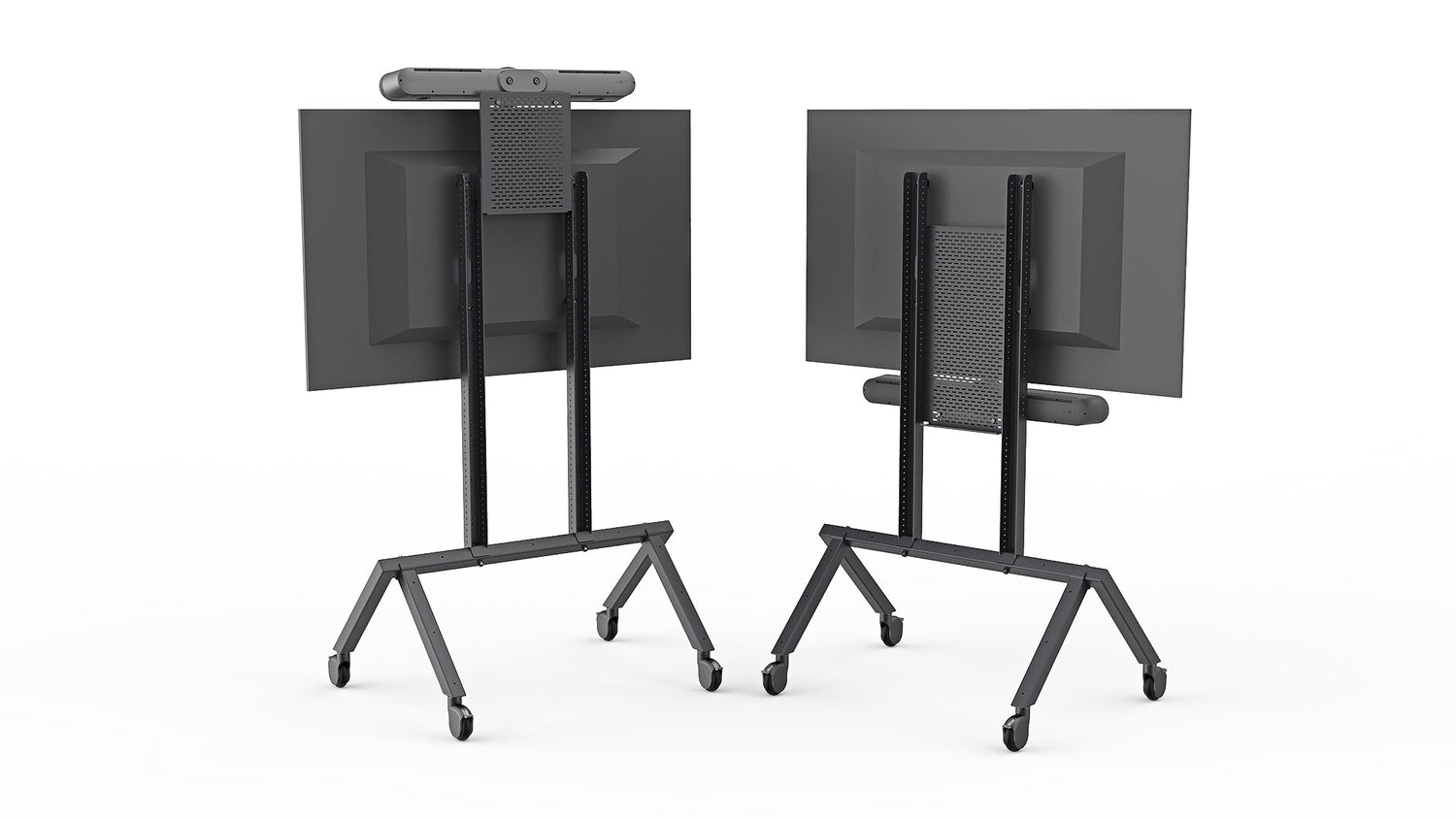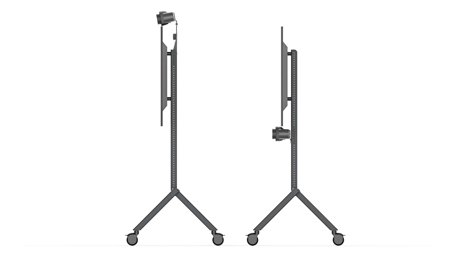 Position Rally Bar at seated eyeline for huddle rooms or at standing height for all-hands meetings. Cart Mount's adjustable angle ensures Rally Bar's camera captures the room effectively in either configuration.