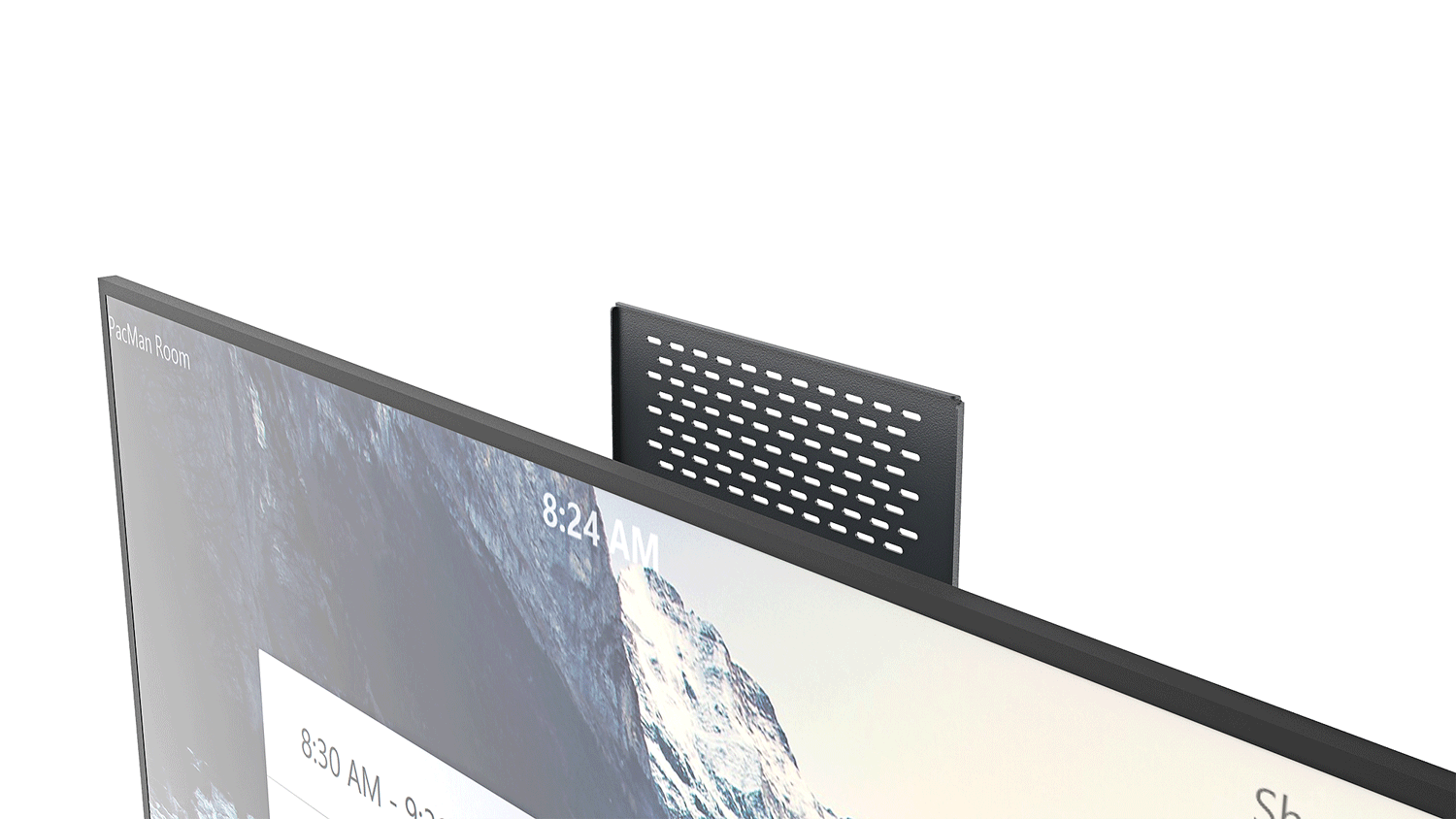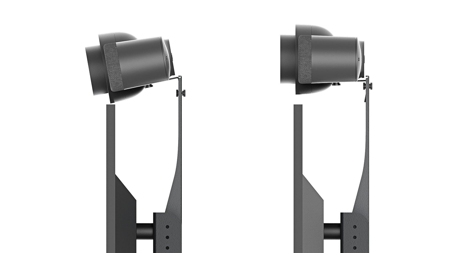 When mounting above the display, choose between level installation for near-field coverage or a downward angle for wide-room capture. The angle is set during installation — no ongoing adjustment needed.