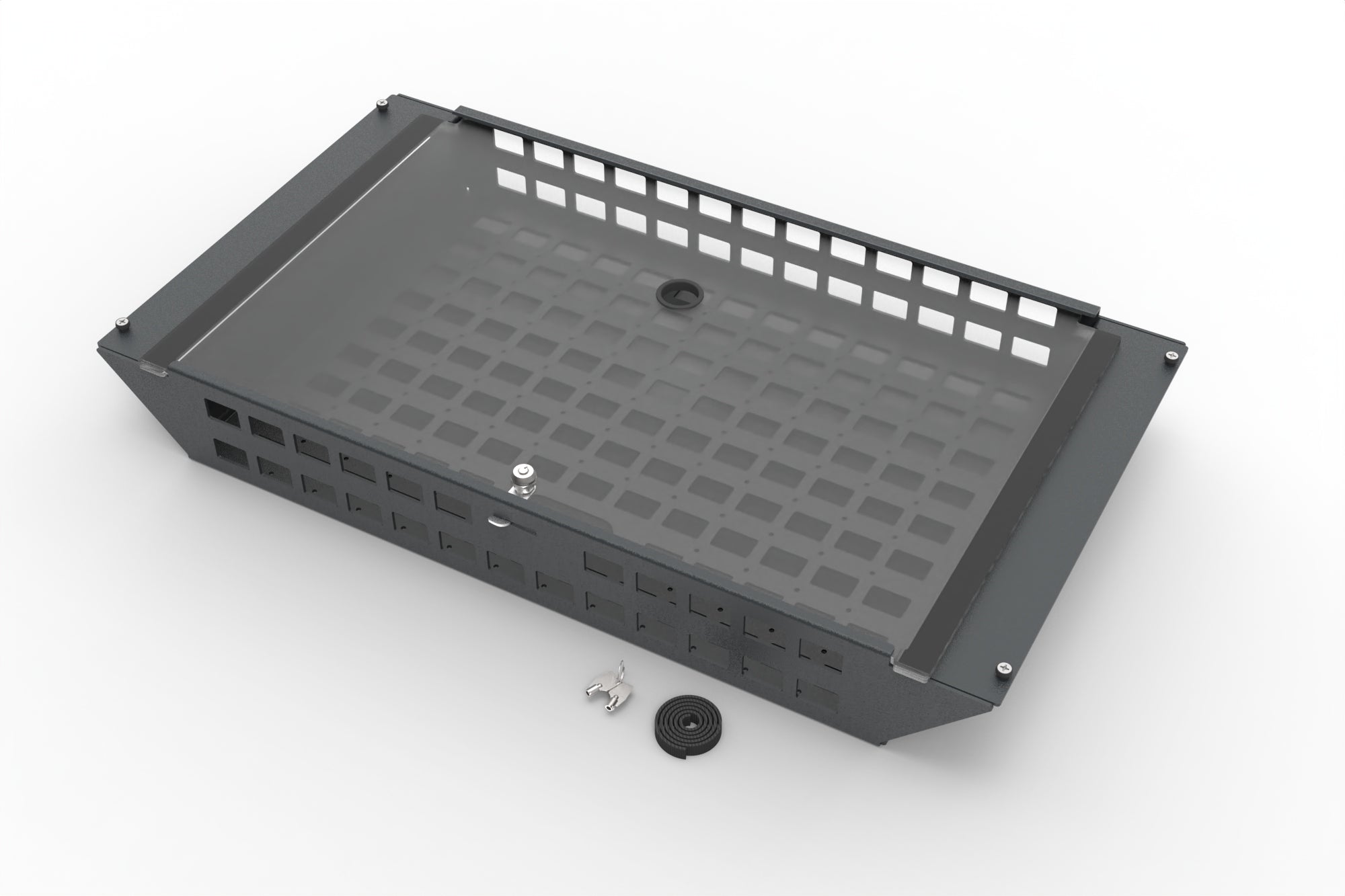 A cam-locked front panel secures valuable equipment, while generous passive airflow keeps gear cool and reliable without the need for noisy fans. The heavy aluminum construction and powder coat finish deliver long-term durability in demanding environments.
