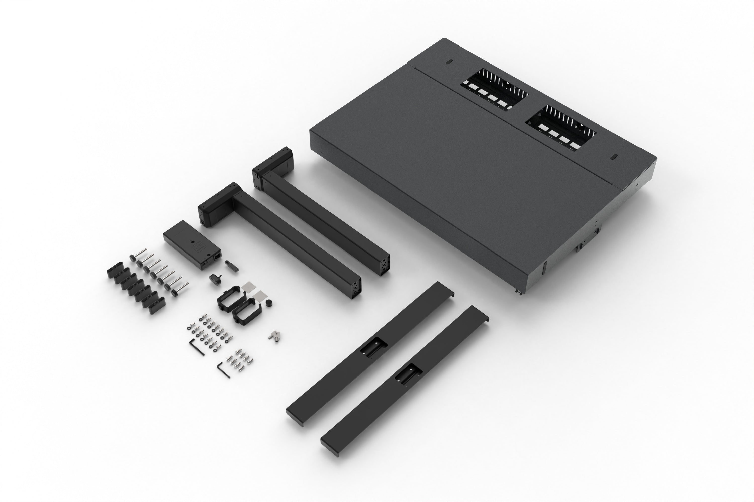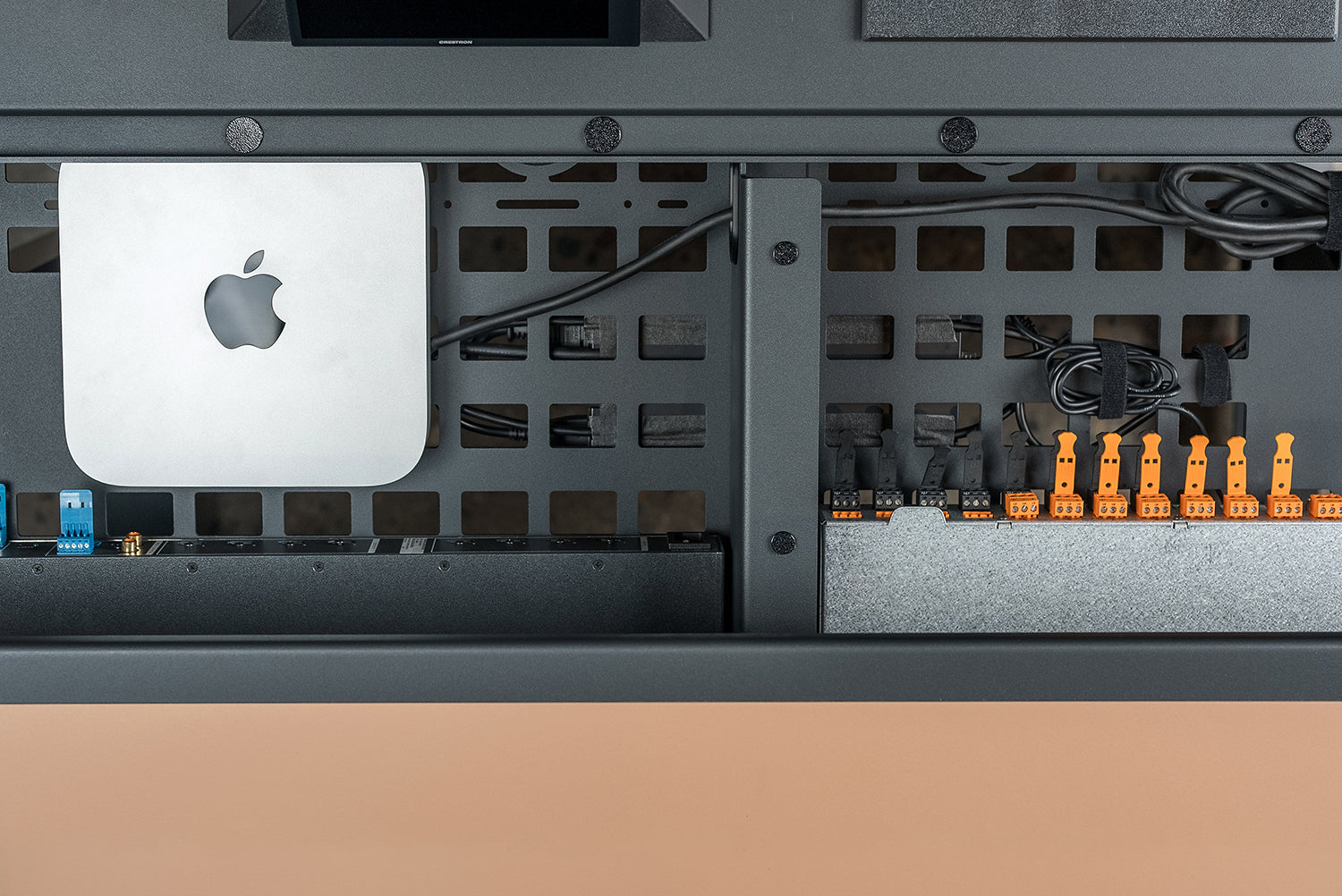 Experience streamlined cable management with our innovative grid system. It offers precise cable routing, neat organization, and easy access in and out of the lectern, all tool-free. This system not only secures small components effortlessly but also enhances airflow, reducing the need for additional cooling fans.