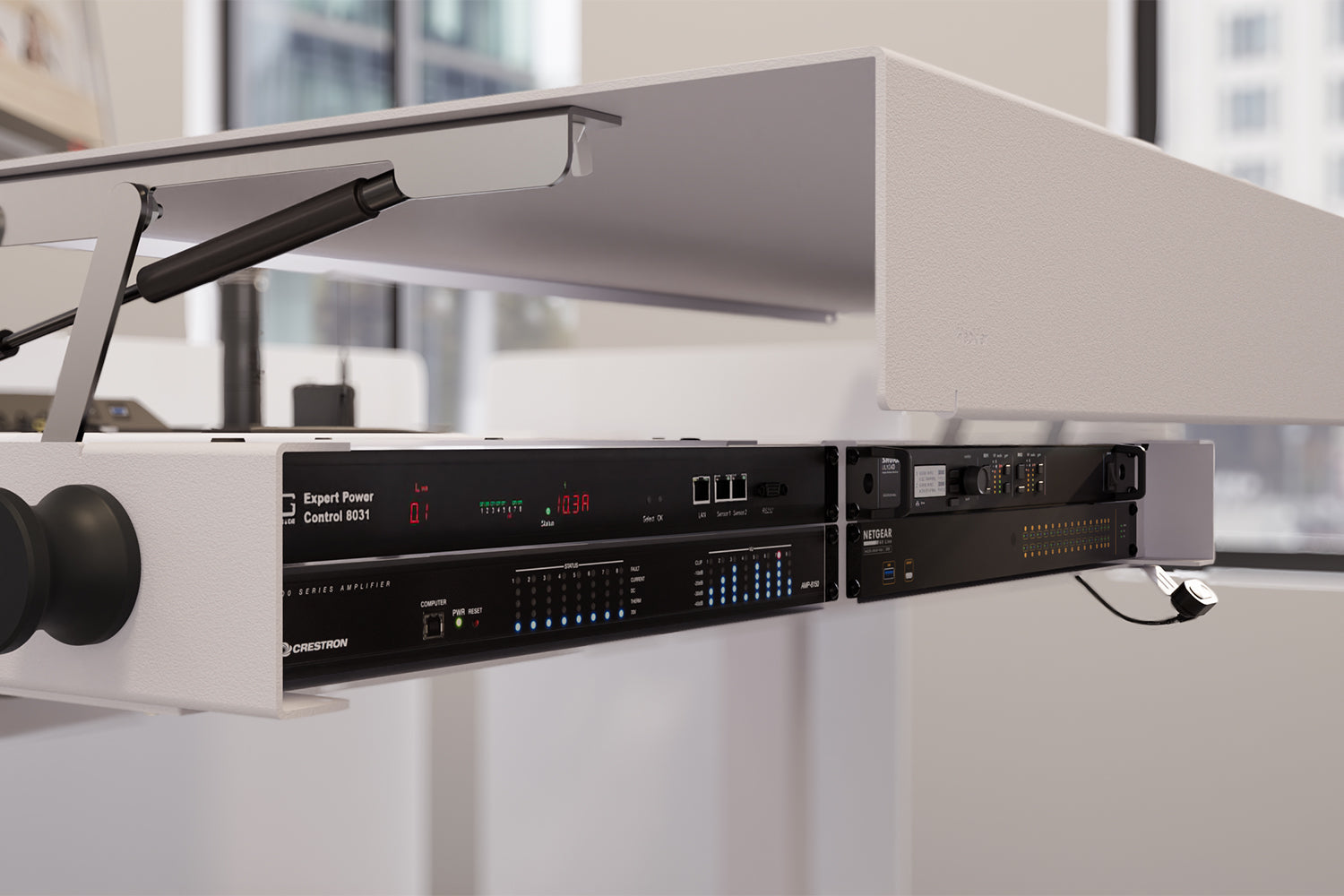 Lectern 4U's dual 2RU component racks, side-by-side, offer efficient storage for essential tech in distance and active learning spaces. The design smartly places component connections close to displays, touchscreens, microphones, and IO ports. This results in a modern, minimalist look that's both practical and aesthetically pleasing.
