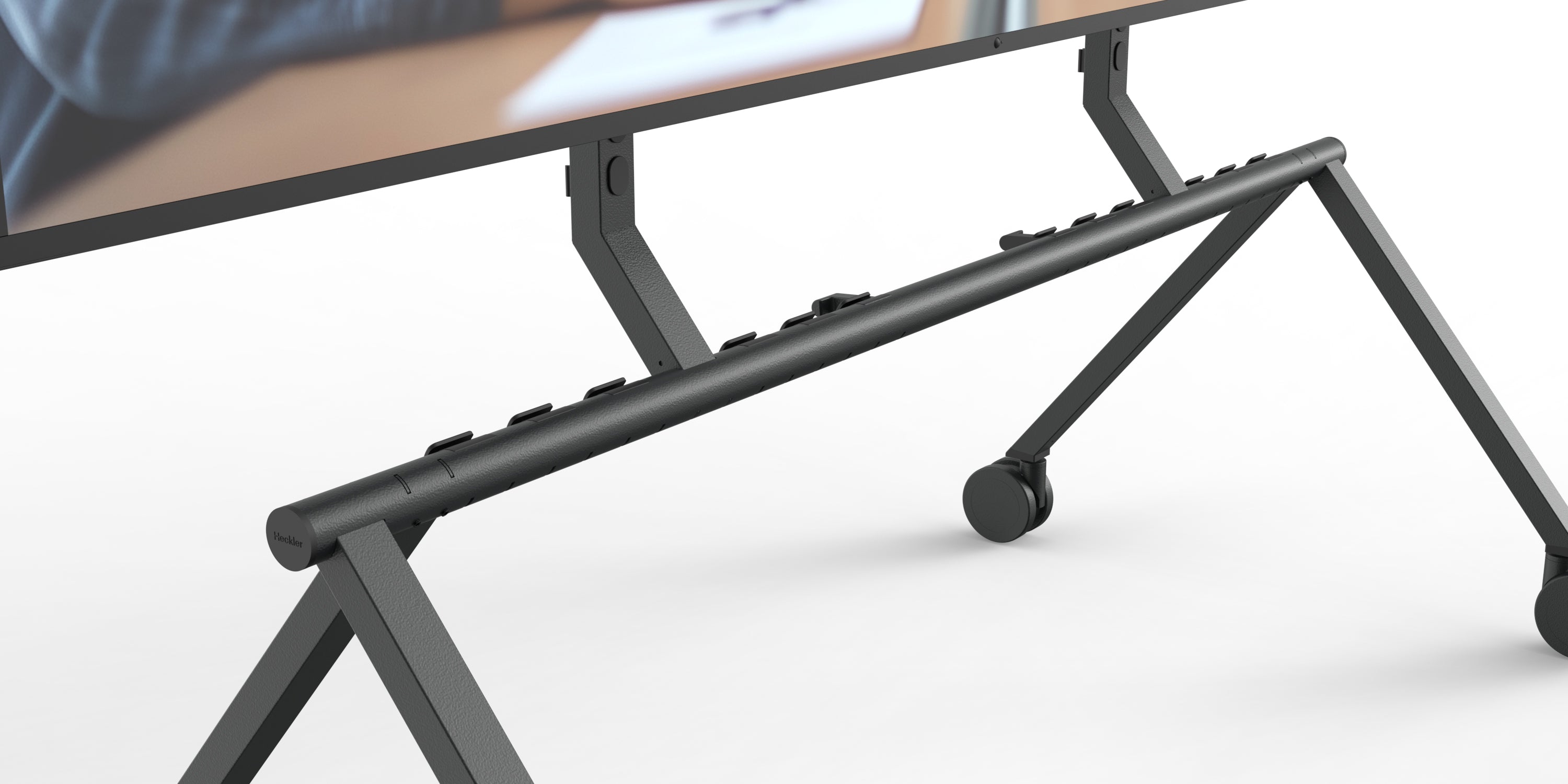 A new patent‑pending Heckler Connection System with set‑screw locking, larger rectangular steel box‑beam legs and columns, and a one‑piece structural beam combine to create a noticeably stiffer, more rigid stand that feels planted and secure—even with the biggest, heaviest displays. Oversized five‑inch total‑lock casters roll smoothly when you need to move and lock firmly when it’s time to present.